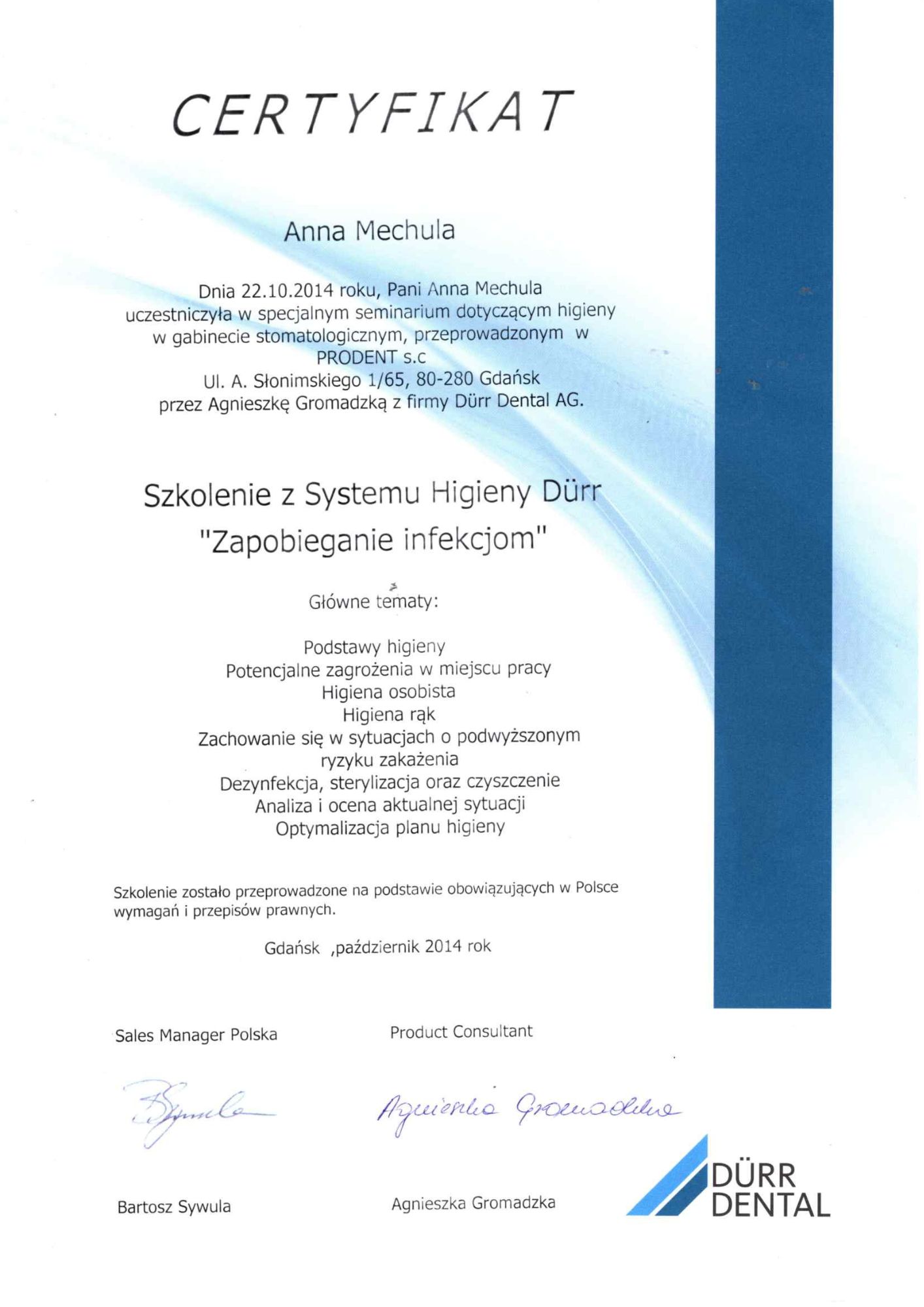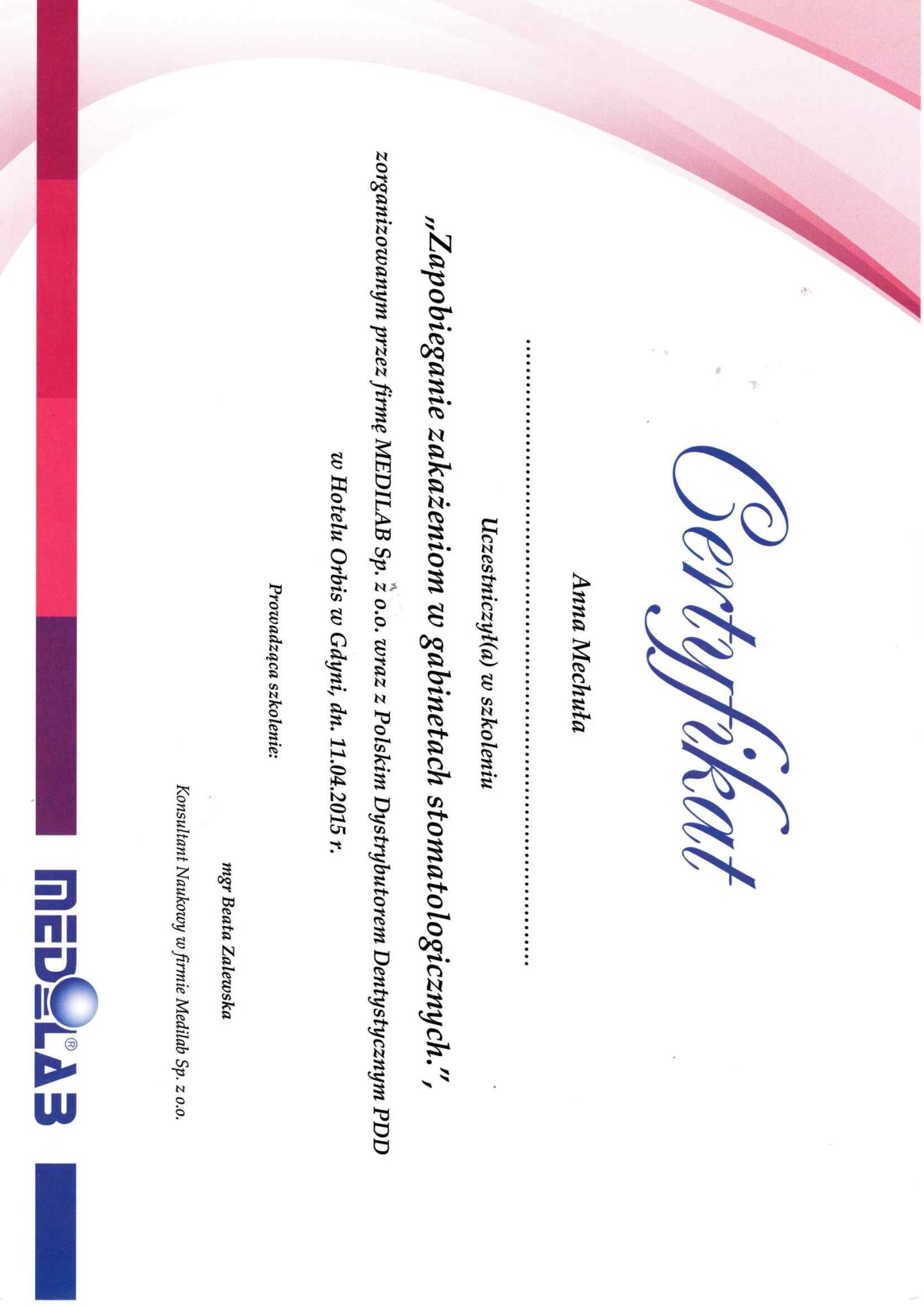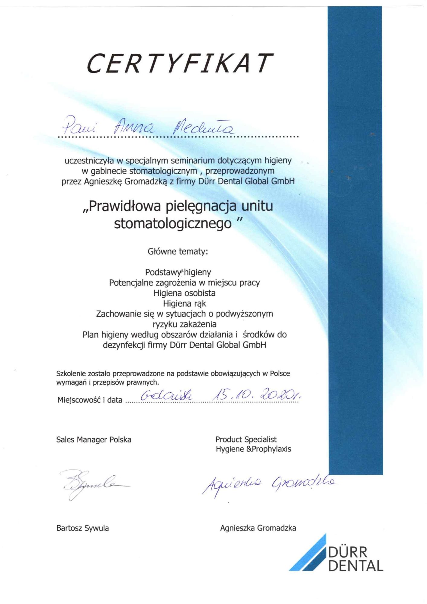 Jest z nami od 23 lat Pracę w naszym Gabinecie rozpoczęła w kwietniu 2003 asystując dr. Urszuli Odya przy zabiegach z zakresu protetyki .W 2005 roku ukończyła kurs z zakresu higienizacji jamy ustnej. Od siedmiu lat współpracuje z dr. Izabelą Pietruczuk asystując przy leczeniu ortodontycznym. Ceni sobie porządek i miłą atmosferę w zespole. Do swojej pracy podchodzi z dużym zaangażowaniem i empatią. Swoją wiedzę regularnie pogłębia na kursach i szkoleniach z zakresu higieny jamy ustnej, profilaktyki oraz higieny w gabinecie stomatologicznym.