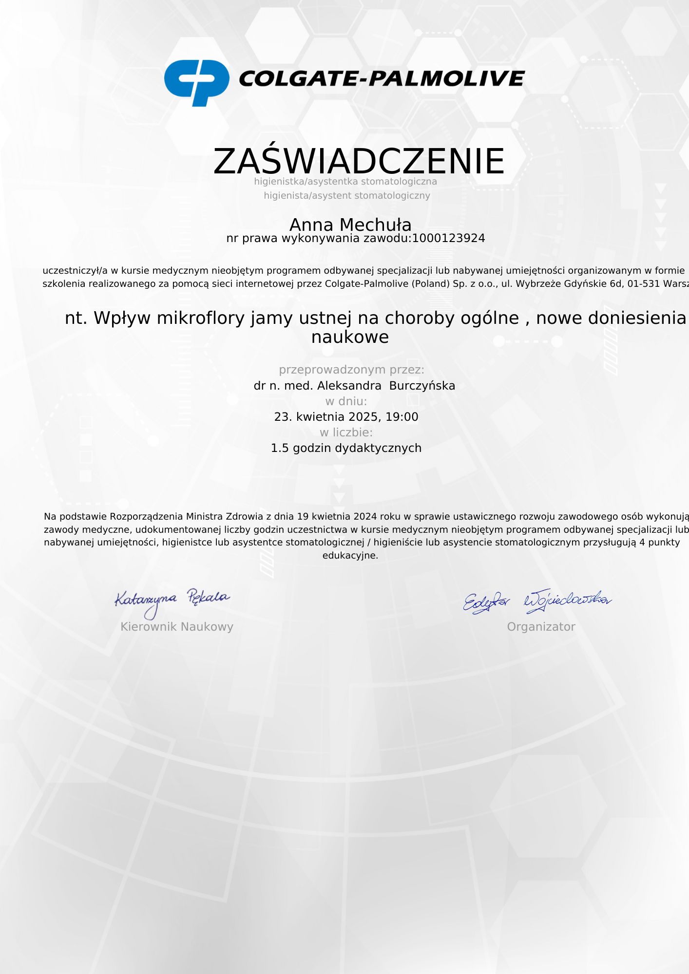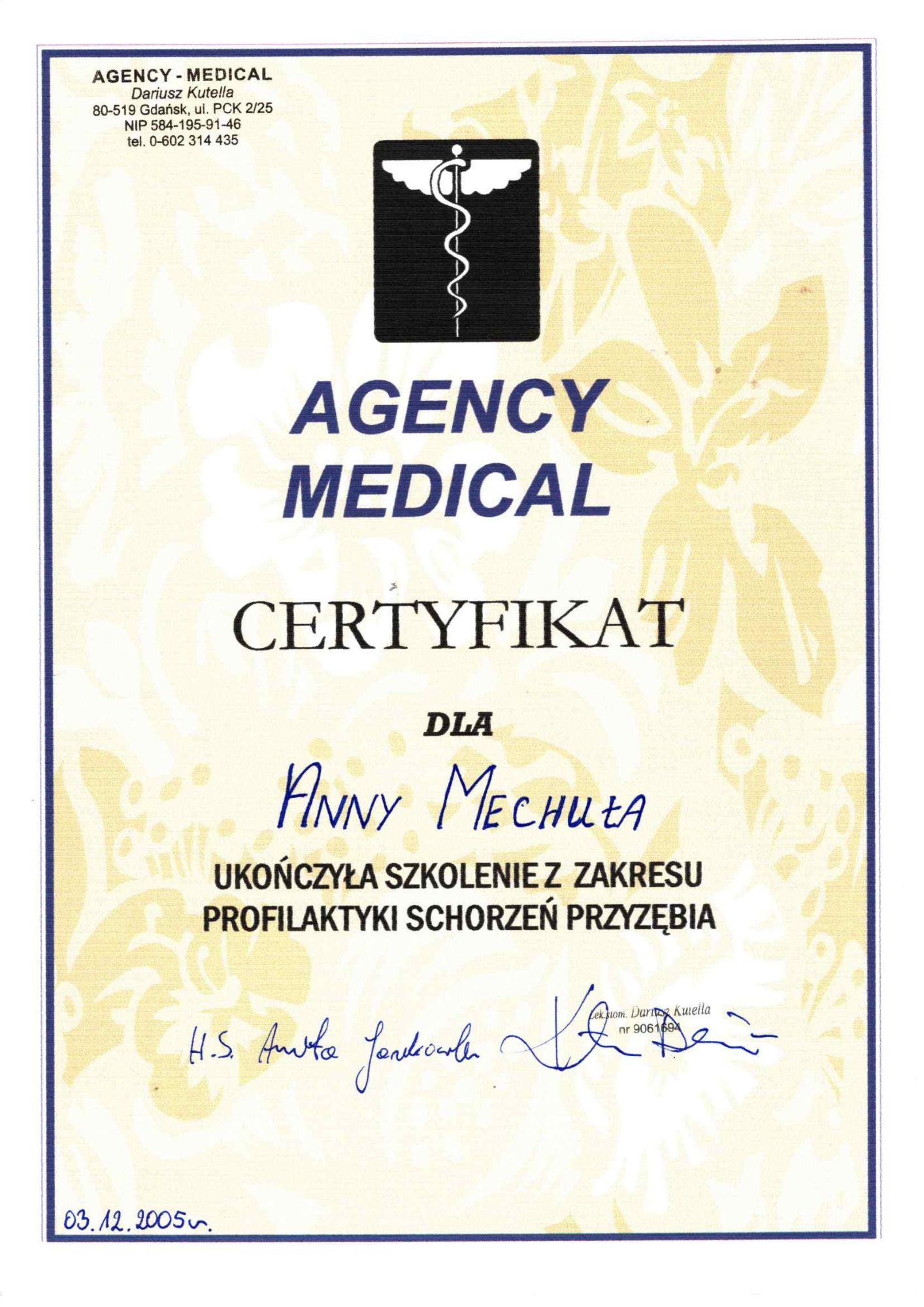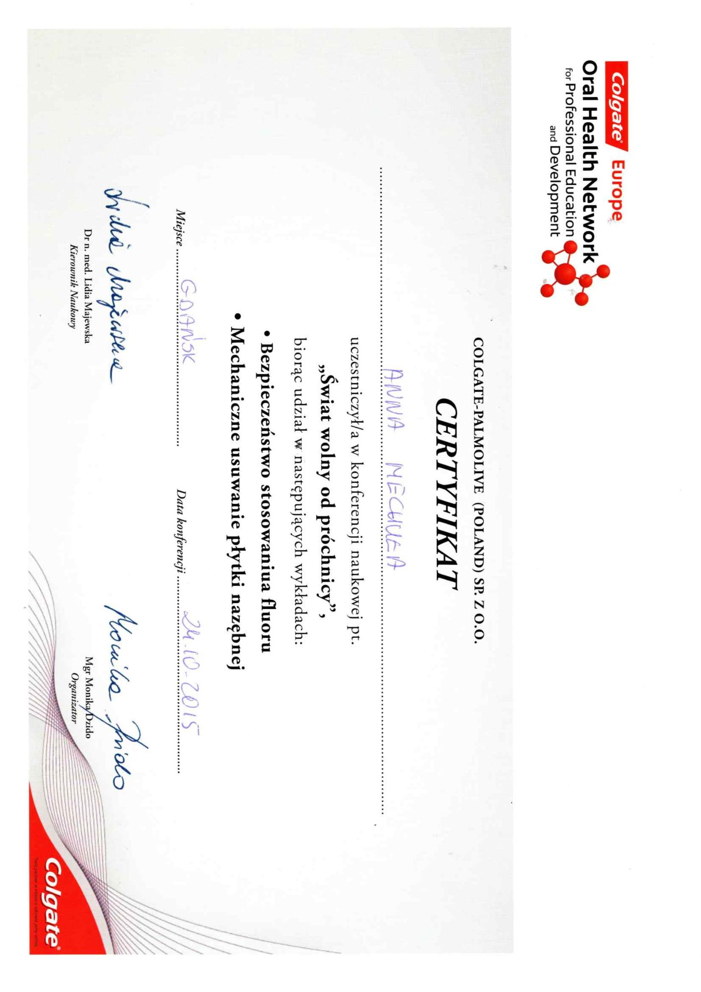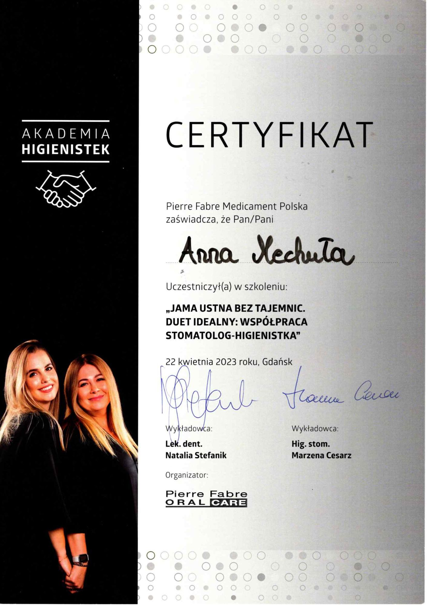Jest z nami od 23 lat Pracę w naszym Gabinecie rozpoczęła w kwietniu 2003 asystując dr. Urszuli Odya przy zabiegach z zakresu protetyki .W 2005 roku ukończyła kurs z zakresu higienizacji jamy ustnej. Od siedmiu lat współpracuje z dr. Izabelą Pietruczuk asystując przy leczeniu ortodontycznym. Ceni sobie porządek i miłą atmosferę w zespole. Do swojej pracy podchodzi z dużym zaangażowaniem i empatią. Swoją wiedzę regularnie pogłębia na kursach i szkoleniach z zakresu higieny jamy ustnej, profilaktyki oraz higieny w gabinecie stomatologicznym.