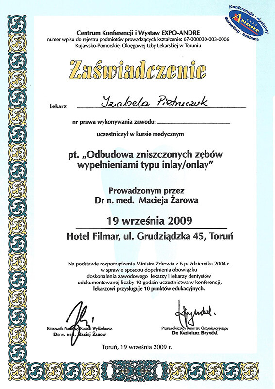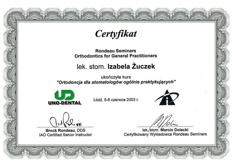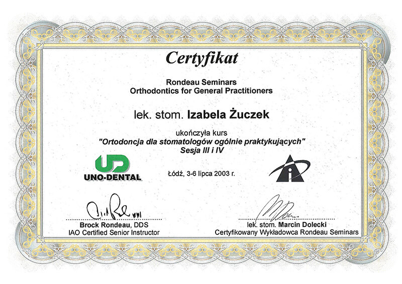 Jestem absolwentką Gdańskiego Uniwersytetu Medycznego, na którym w 2000 roku uzyskałam dyplom lekarza dentysty. Moją pasją od początku edukacji na wydziale stomatologii jest właśnie ortodoncja. Od 2001 roku nieprzerwanie dokształcam się rozwijając tę pasję. Ukończyłam liczne szkolenia z zakresu leczenia wad ortodontycznych, obejmujące szereg aspektów dotyczących leczenia ortodontycznego, takich jak leczenie wad zębowych i szkieletowych różnego typu, leczenie ortodontyczno-chirurgiczne wad gnatycznych, leczenie dysfunkcji stawów skroniowo-żuchwowych, sprowadzanie zębów zatrzymanych, leczenie czynnościowe w okresie wzrostu i wiele innych.
