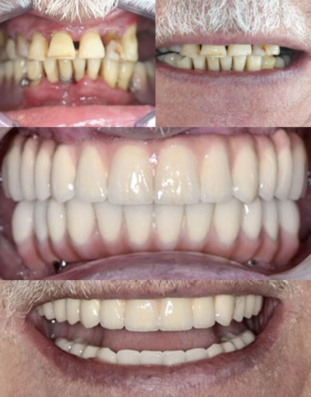 Pacjent pojawił się w celu wymiany starych uzupełnień protetycznych. Po badaniu i analizie wykonanych zdjęć tomografii komputerowej stwierdzono, że wszystkie zęby obecne w jamie ustnej niestety z powodu paradontozy będzie trzeba usunąć. Zaproponowano pacjentowi implantacje natychmiastową w żuchwie wraz z jednoczesnym przykręcanym mostem tymczasowym na implantach -rozwiazanie typu „all on six „. W szczęce natomiast z powodu bardzo złych warunków -zabiegi sinus lift obustronny oraz po kilku miesiącach implantacje oraz protezę typu overdenture wspartą na belce tytanowej