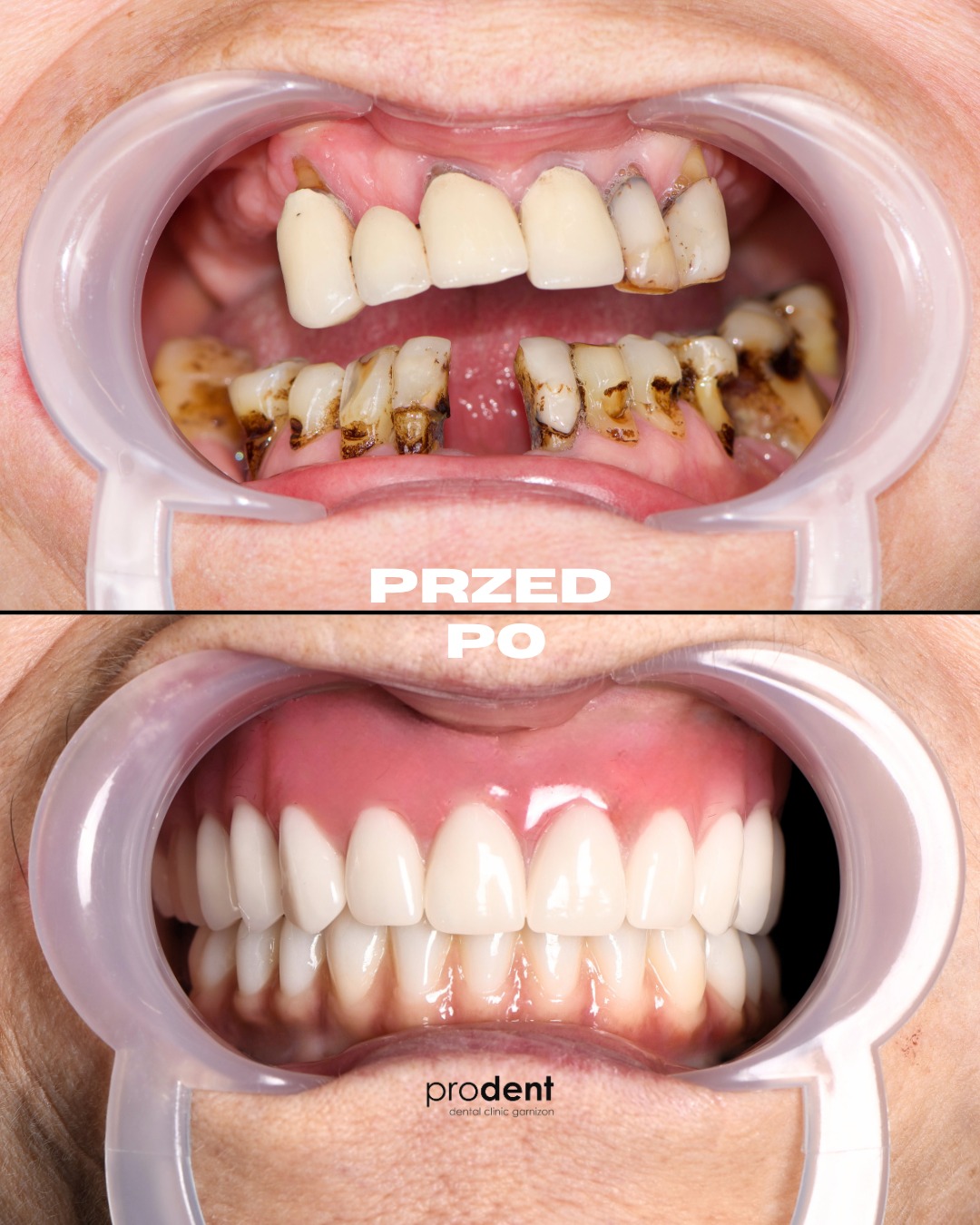 W jeden dzień wykonano ekstrakcję zębów, wszczepienie implantów i osadzenie tymczasowej pracy protetycznej.